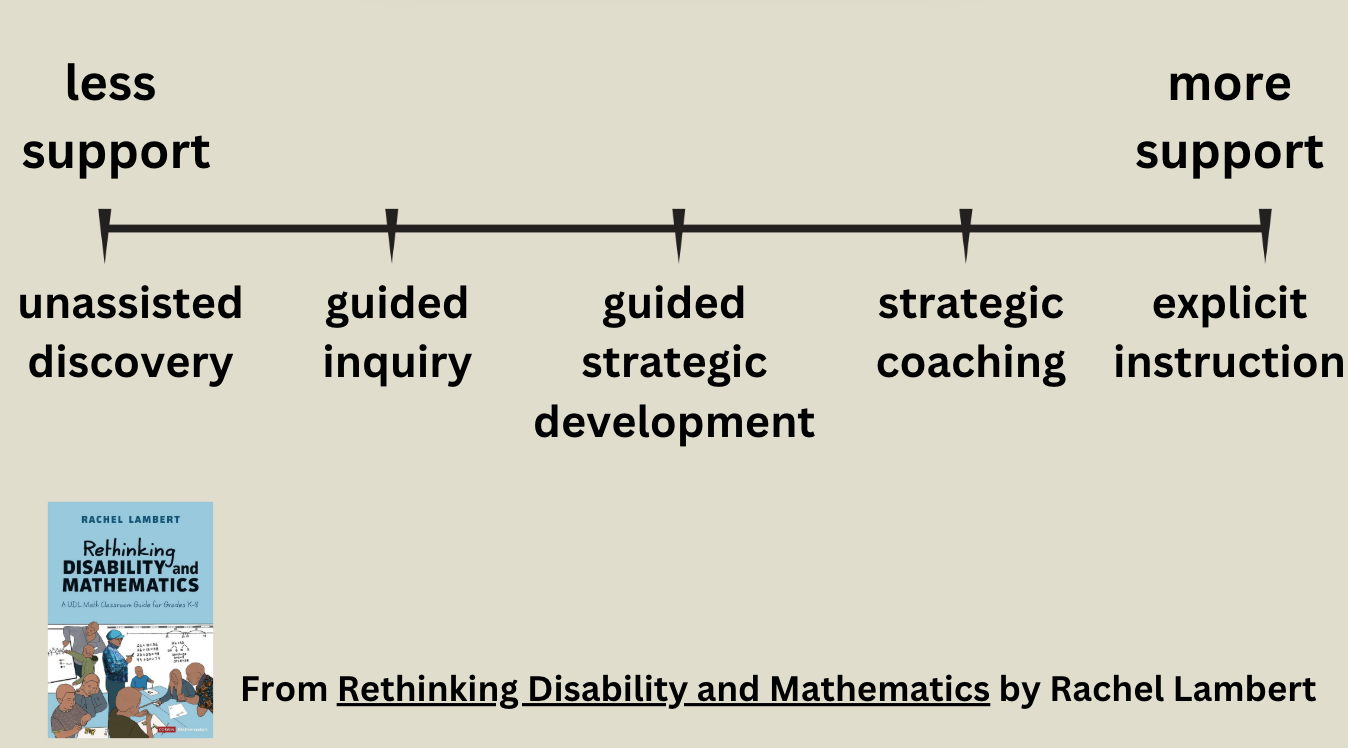But getting the right answer is important. So what’s the balance? How do we define success? I love the part of Rachel Lambert’s book, Rethinking Disability and Mathematics where she talks about it not being a binary choice how we teach math. We can think of it as a continuum where we access the approach right for the lesson, sometimes even going between these approaches in a single lesson! In Petals Around the Rose, explicit instruction would not be a good choice. Guided inquiry allows for students to notice and make sense of the pattern.